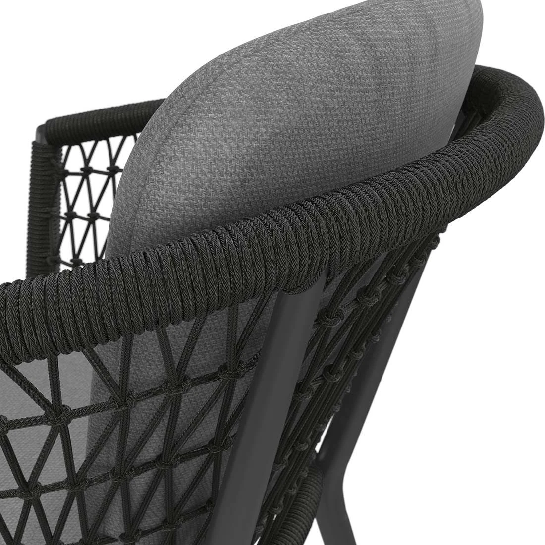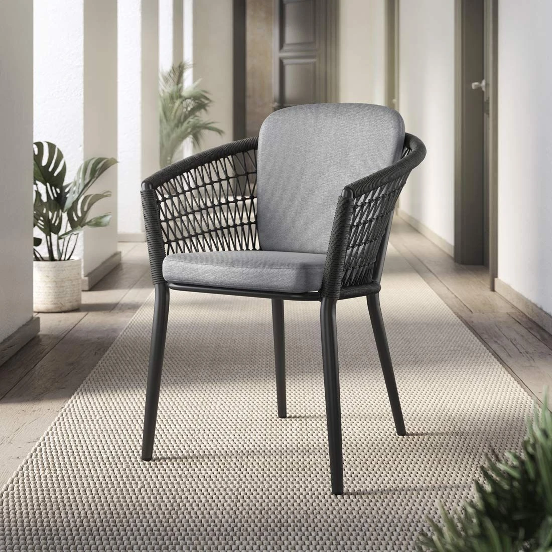 Das Gestell wird aus Aluminium gefertigt. Das geringe Eigengewicht des Materials macht den Gartensessel zu einem robusten, aber dennoch leicht zu transportierenden Sitzmöbel auf Ihrer Terrasse. Hochwertiges Rope umgibt das robuste Gestell und verleiht dem Gartensessel damit einen ganz besonderen Look. Die Bezüge sind aus dem Marken-Outdoorstoff Olefin gefertigt. Das Material verbindet eine angenehme Stoffoberfläche mit hoher Witterungsbeständigkeit. Denn sowohl Sonne als auch Regen können dem robusten Outdoor-Stoff kaum etwas anhaben. Farblich begeistert der Bezug in elegantem Dunkelgrau. Damit der Gartensessel optisch ansprechend ist, sind das Gestell und der Korpus im Farbton Schwarz gehalten.