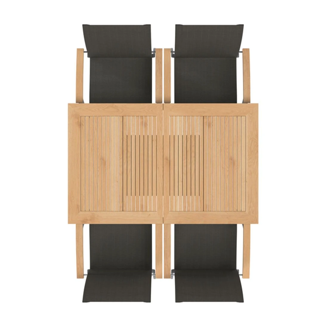 Im Preis des Sets ist ein passender Tisch enthalten. Teak ist außerordentlich widerstandsfähig gegen Witterungseinflüsse wie Temperaturschwankungen, Nässe und Trockenheit. Kein Wunder, dass dieses hochwertige Hartholz als Material für die Tischplatte verwendet wird. Mit der rechteckigen Form lässt sich der Tisch platzsparend in Ecken oder an Häuserwänden aufstellen.