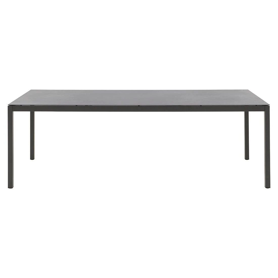 Das Gestell des leichten Tisches ist aus Aluminium hergestellt. Das klassische Vierfuß-Gestell garantiert Ihnen maximale Beinfreiheit. Für die Tischplatte wird das Naturmaterial Keramik verwendet. Keramikplatten sind stoß-, schlag- und schnittbeständig und zählen somit zu den stabilsten Tischplatten auf dem Gartentisch-Markt. Farblich ist die Platte in Concrete Coal gehalten. Die rechteckige Form ermöglicht es Ihnen, den Gartentisch in Ecken und an Häuserwänden platzsparend einzusetzen.