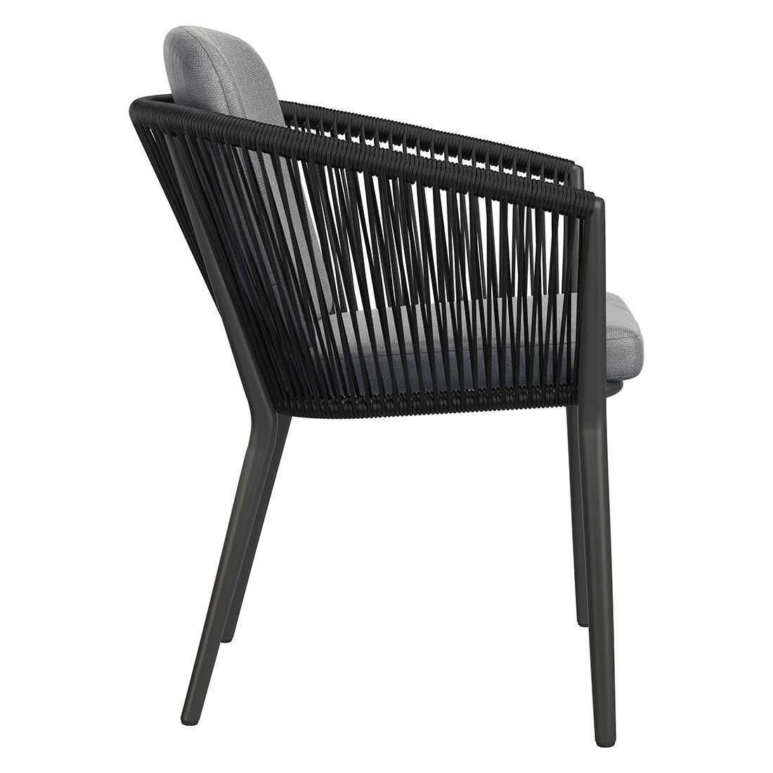 Das Gestell besteht aus pflegeleichtem und wetterfestem Aluminium. Hochwertiges Rope umgibt das robuste Gestell und verleiht dem Gartensessel damit einen ganz besonderen Look. Für die Bezüge wird Olefin verwendet. Der Marken-Outdoorstoff überzeugt mit einer hohen Witterungsbeständigkeit. Denn sowohl Sonne als auch Regen können dem robusten Outdoor-Stoff kaum etwas anhaben. Farblich begeistert der Bezug in elegantem Dunkelgrau. Damit der Gartensessel optisch ansprechend ist, sind das Gestell und der Korpus im Farbton Schwarz gehalten.