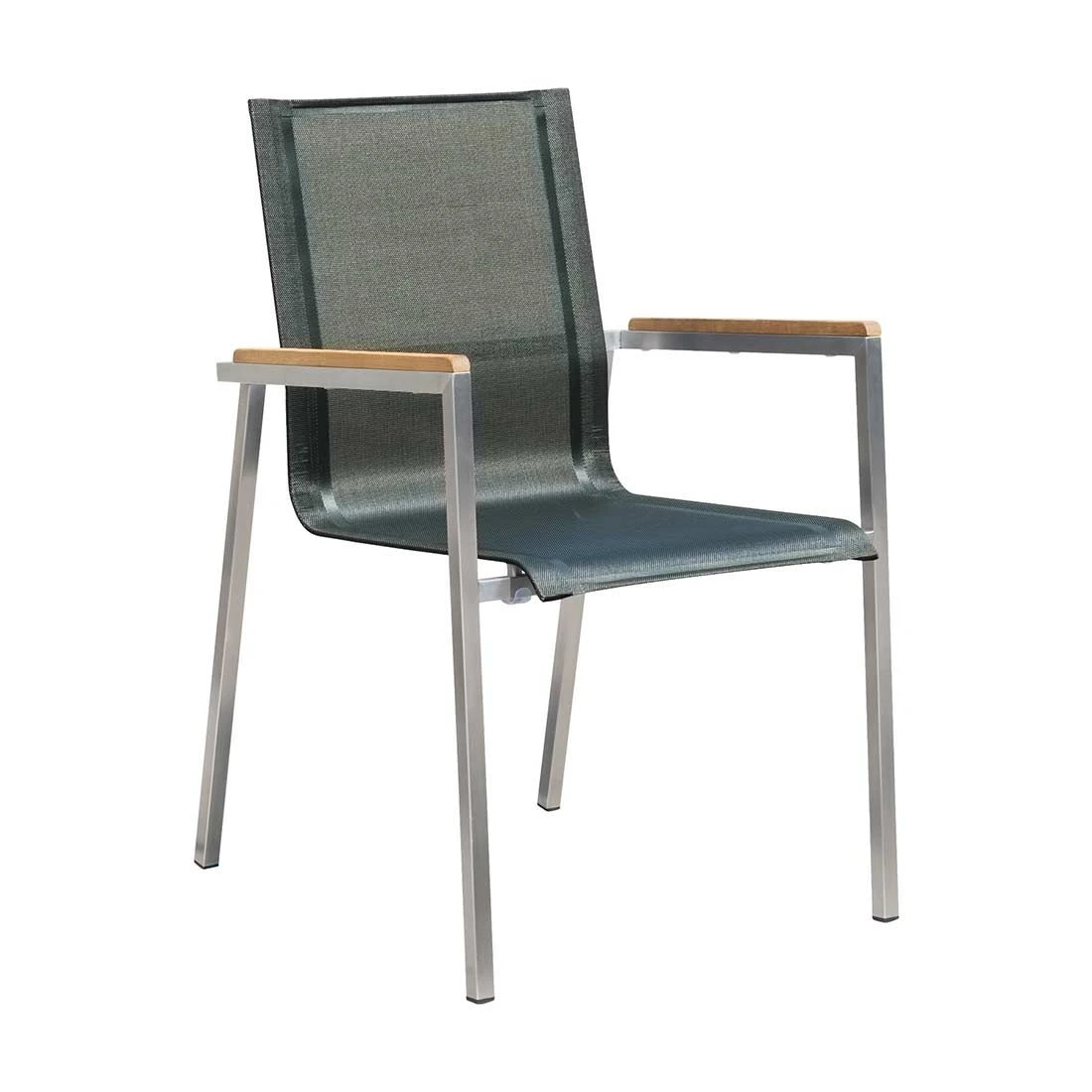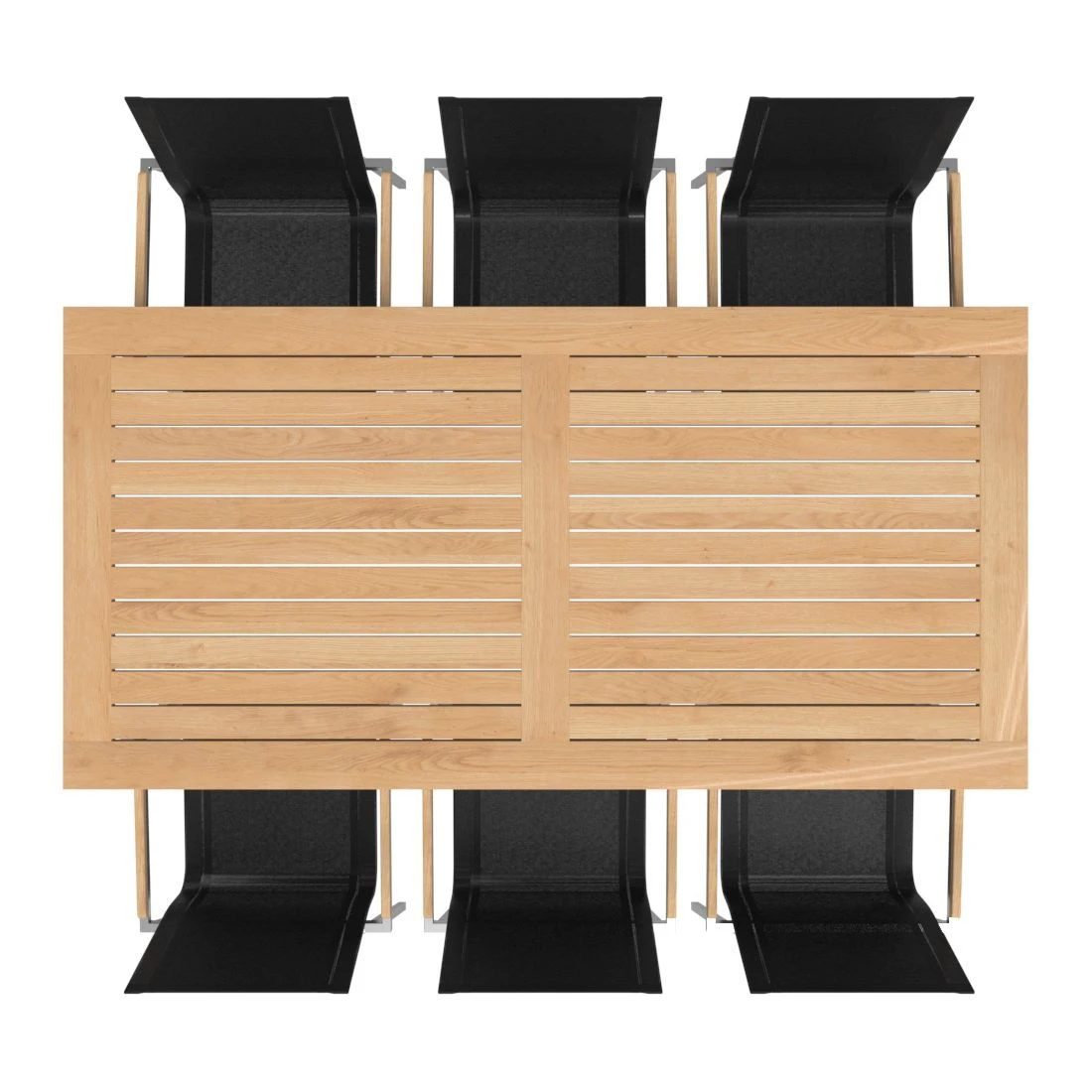 Die Gestelle sind aus Edelstahl gefertigt und sorgen somit für einen modernen Look und eine hohe Stabilität. Optisch ansprechend ist die Farbgebung der Gestelle in Silber. Ein weiteres Highlight der Sitzmöbel ist die Bespannung der Sitzflächen mit Textilene. Dieses Material zeichnet sich durch eine hohe Robustheit gegenüber Hitze und Frost aus und ist leicht zu reinigen. Die Sitzflächen und die Bezüge sind einheitlich im Farbton Schwarz gehalten. Im Set enthalten ist auch ein passender Tisch. Die Platte des Tisches ist aus hochwertigem Teak hergestellt. Aufgrund des sehr hohen natürlichen Ölanteils, ist sie damit ausgezeichnet vor Witterungseinflüssen geschützt. Zum Set gehört auch ein passender Tisch. Dessen Tischplatte ist aus Teakholz Natur in der Farbe Teak Natur gefertigt und rundet das stimmige Gesamtbild des Gartenmöbel-Sets ab. Der Tisch ist klassisch rechteckig gestaltet. Farblich ist das Gestell in Silber gehalten, die Tischplatte überzeugt in der Farbe Teak Natur.